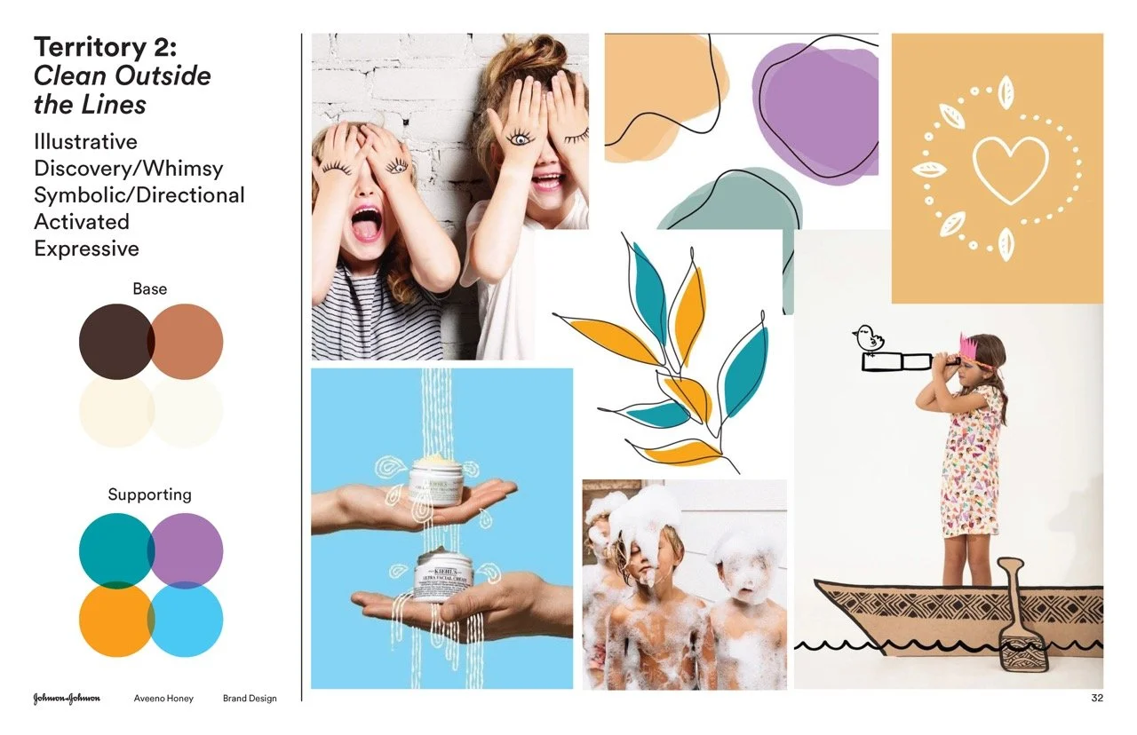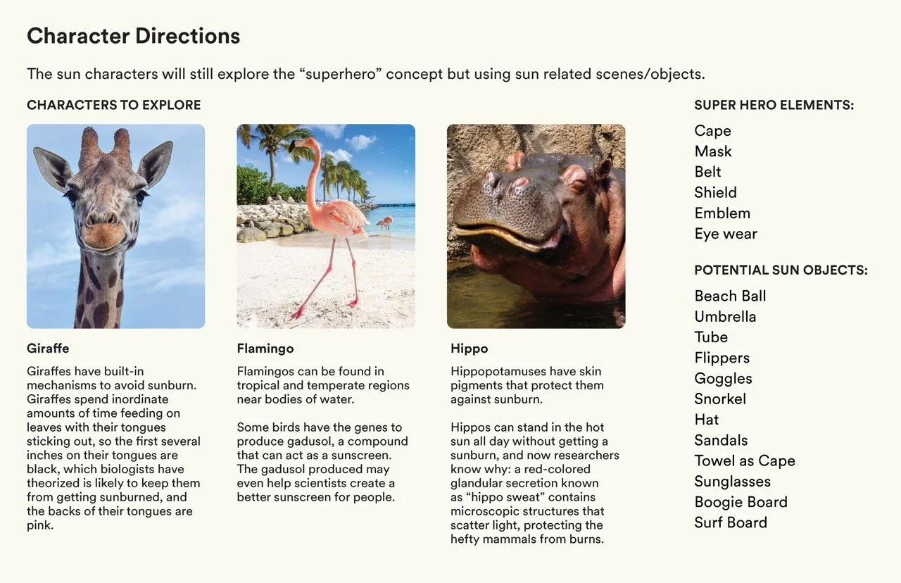 To bring the product lineup to life, we created characters with stories that emotionally connect with kids. Partnering with brand strategists, we defined archetypes to reflect diverse behaviors, then named and shaped each character’s story to support kids on their self-care journey. With clear intentions for each, we developed an illustration brief to translate them into Aveeno’s signature style.